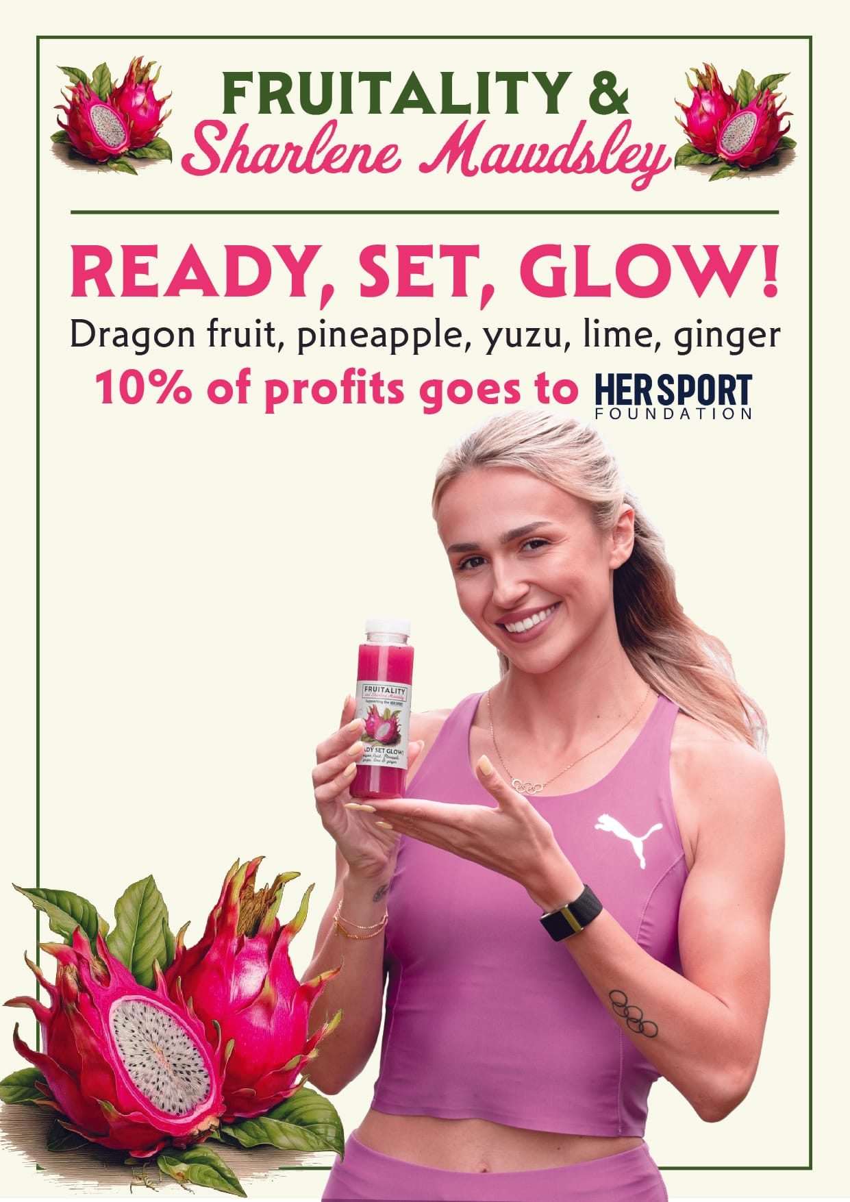 “I am delighted to collaborate with Fruitality on our energy boosting juice, ‘’Ready set glow!’’. Not only is it fresh and healthy, 10% of profits from every bottle sold will be donated to Her Sport. Her Sport proactively empowers women in sport. At the moment, twice as many girls drop out of sport than boys by the age of 14. I am passionate about changing this and want to encourage young girls to stay in sport. It’s so important for physical and mental health.